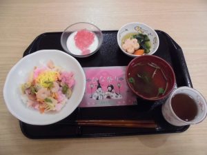 ♫あかりをつけましょ ぼんぼりに♫春の風物詩のひとつでもある『桃の節句』雛ちらし寿司やひし餅風ゼリーなど、ひなまつりを祝うお料理をご提供しました。