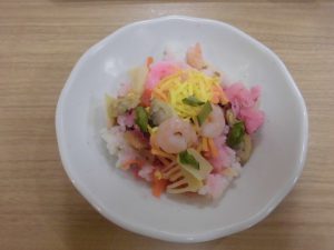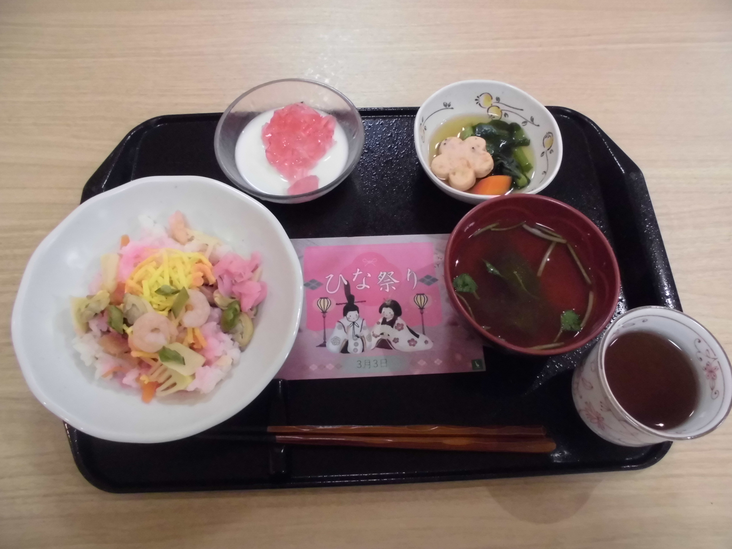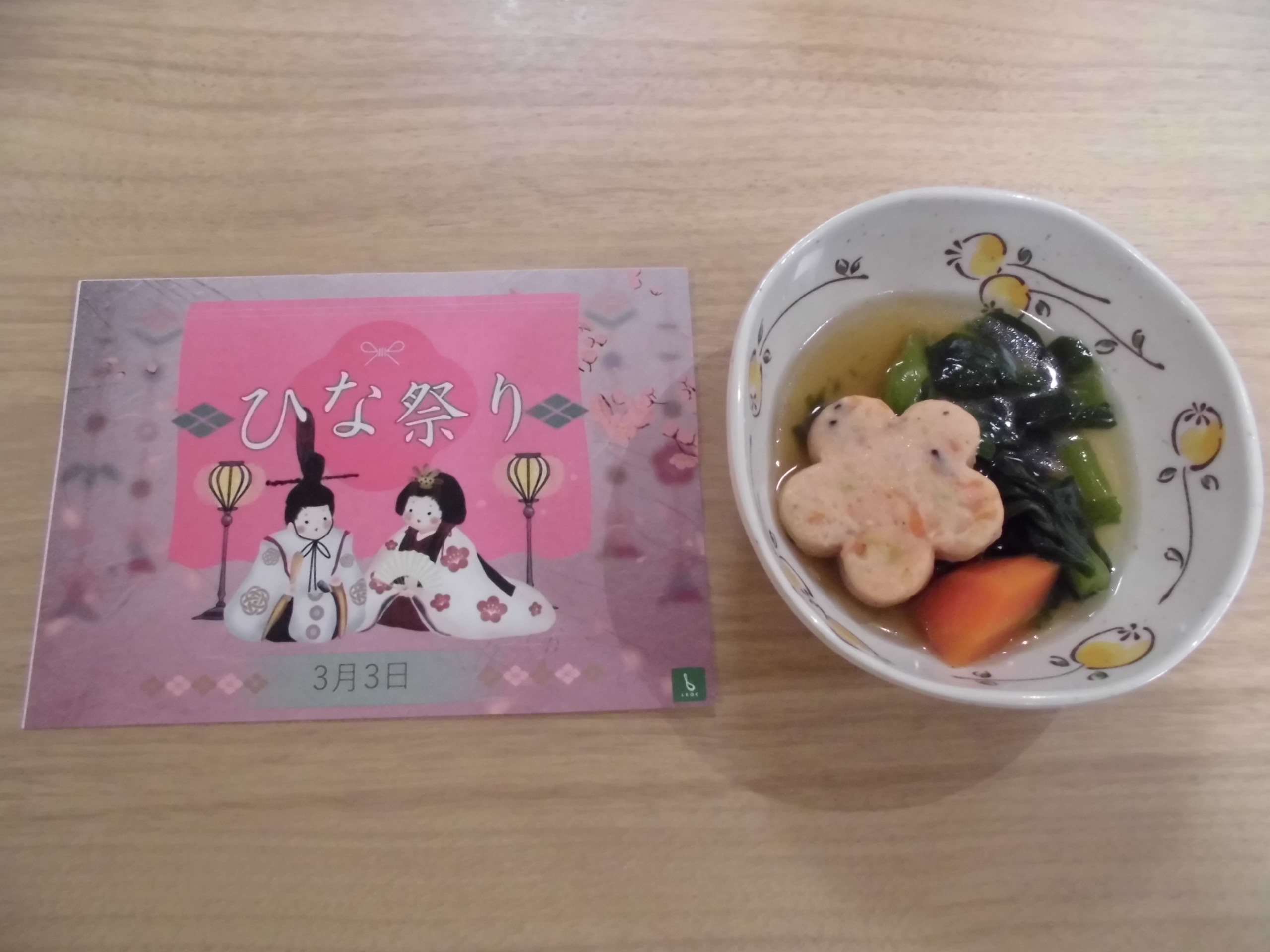 「ひな祭り」のメッセージカードをお付けした彩りがとてもきれいな料理に、ひな祭り気分を味わっていただけたようで、入居者様の会話も弾んでいました。
